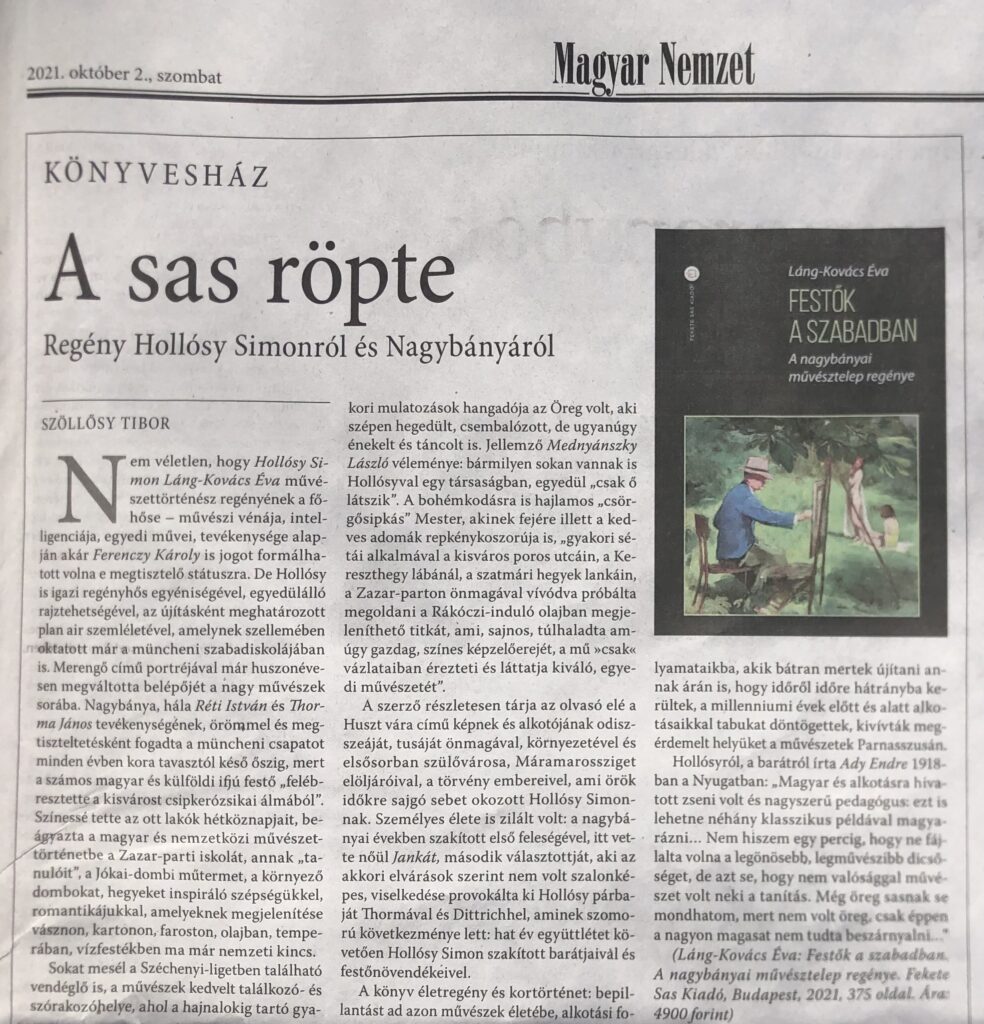„Láng-Kovács Éva művészettörténész Nagybánya-krónikája regénynek is páratlan értékű, sodró, ugyanakkor a legjobb értelemben szakszerű is, a történet végén gazdag irodalomjegyzékkel, s – természetesen – gazdag műmelléklet anyaggal.“ – Dr. habil Petrőczi Éva József Attila-díjas költő, író, műfordító, irodalomtörténész