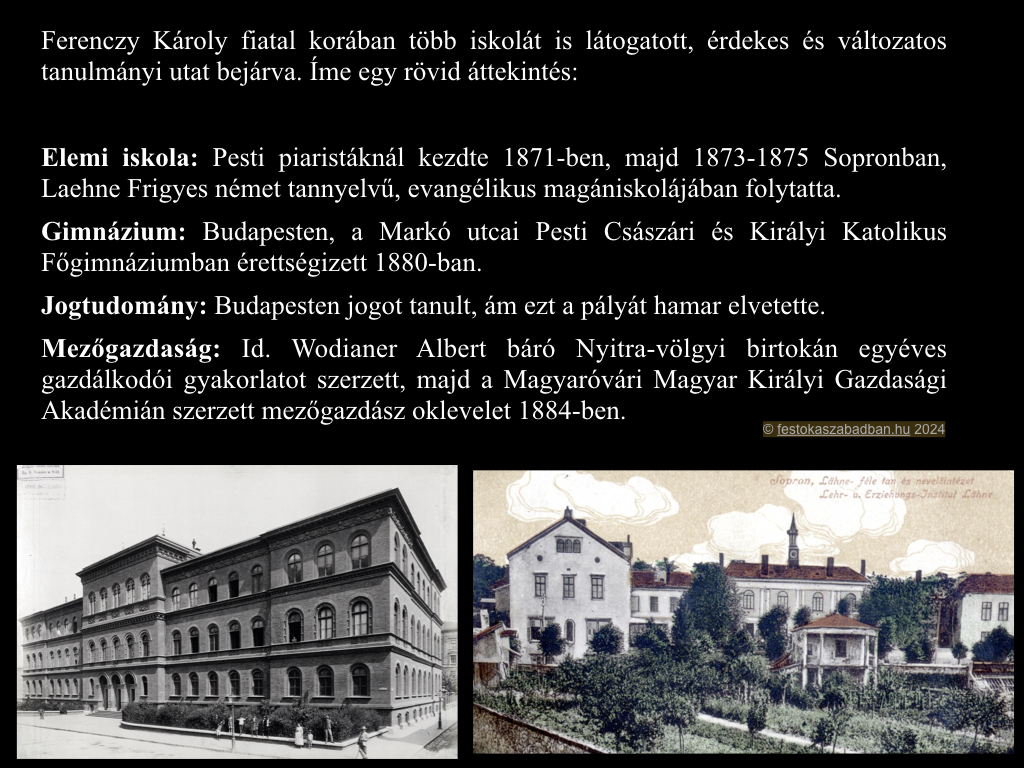 Először Carolus Budapesten jogi, majd Magyaróváron mezőgazdasági tanulmányokat folytatott. Életében a fordulatot egy hölgy, Fialka Olga hozta el. Másodunokatestvére képzett művész volt, aki a bécsi akadémián tanult festészetet. A két ember között szövődő szerelem Ferenczy értékrendjét is átalakította. Együtt utaztak el 1884-ben itáliai tanulmányútra, és a következő évben összeházasodtak. Mindhárom gyermek művésszé vált: Valér festő, Béni szobrász, Noémi gobelinművészként élte életét.