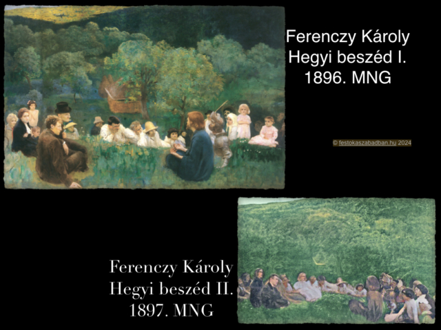 A kompozíció helyszíne a nagybányai minorita rendház szőlője, akkori nevén a Papok rétje. Krisztus tanítványai és hallgatósága a nagybányai emberekből verődik össze. A bányászok, földművesek között felbukkannak Ferenczy gyermekei, festőtársai, Krisztus figurájához pedig testvére, Ferenczy Ferenc ült modellt. A legkülönösebb szereplő a Krisztus mellett helyet foglaló páncélos vitéz. Ám épp az ő alakja fejezi ki legnyilvánvalóbban azt, hogy Krisztus tanításai korszaktól, helytől függetlenül is egyetemesnek tekinthetők.