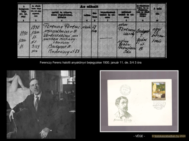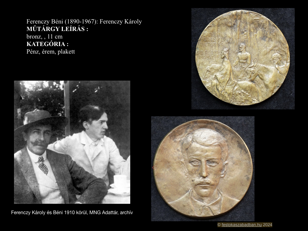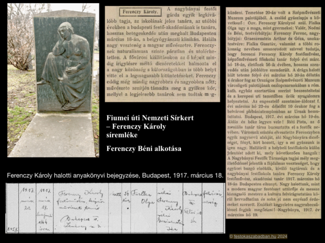 Ferenczy Károlynak sírdomborművét fia, Béni készítette. Ferenczy Béni a 20. századi magyar művészet egyik kiemelkedő egyénisége, a szobrászat mellett kiváló érem- és rajzművész is volt. A művész eredetileg az 1918-ban készített Szerelmespár című domborművét szánta apja sírjára, ám ennek bronzba öntésére már nem kerülhetett sor, mivel emigrálni kényszerült. A gipszdomborművet sok évtizeddel később, 2007-ben öntötték csak bronzba, és helyezték el a Pesti Vigadó épületének falán. A második világháború után ismét hozzálátott apja síremlékének tervezéséhez, ezt súlyos betegsége, agyi embóliája miatt kellett abbahagynia. Elveszítette beszédkészségét, felgyógyulva, bal kezével folytatta apja síremlékdomborművének készítését. A kivitelezés költségeit a főváros vállalta fel, így az emlék felállítására a festőművész születésének 100. évfordulóján került sor. Több műve bizonyítja tudatos kapcsolódását a művészet klasszikus tradícióihoz. Esetleg Réti hatása?